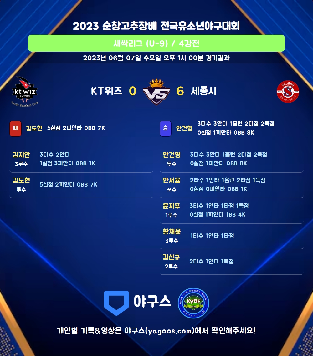 | 2 | 一 | 윤지후(3) | 좌전2 | 삼진 | - | 3땅 | - | 3 | 1 | 1 | 1 | 0 | 0 | - | 1 | 0.333 |