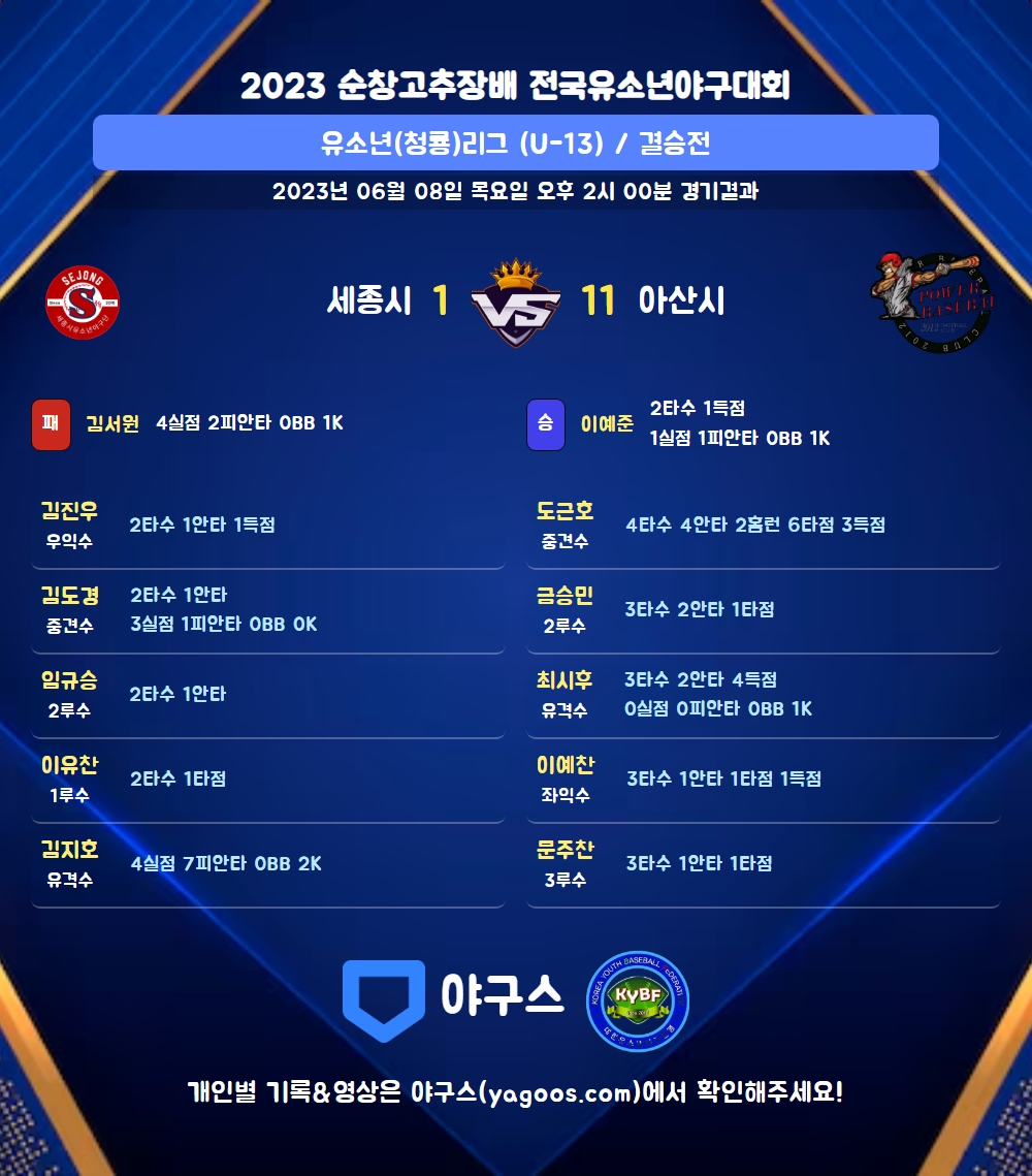 | 2 | 三 | 고준서(50) | 삼진 | - | - | 1땅 | - | 우플 | 3 | 0 | 0 | 0 | 0 | 0 | - | 1 | 0.000 |