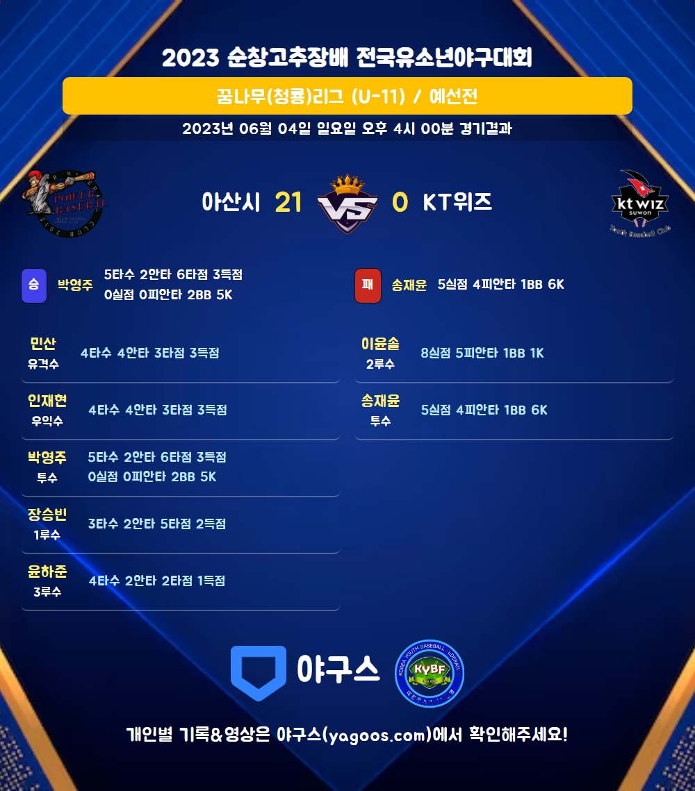 | 6 | 三 | 윤하준(1) | 삼진 | 1땅삼중살 | - | - | 4 | 2 | 2 | 1 | 0 | 0 | - | 1 | 0.500 |