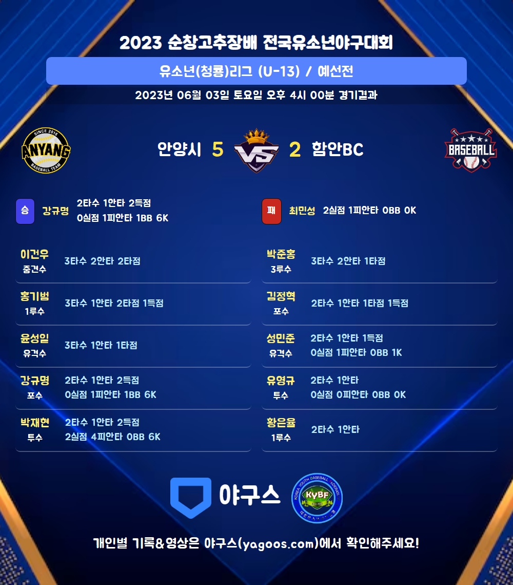 | 3 | 투 | 강민준(57) | 삼진 | - | - | - | - | 1 | 0 | 0 | 0 | 0 | 0 | - | 1 | 0.000 |