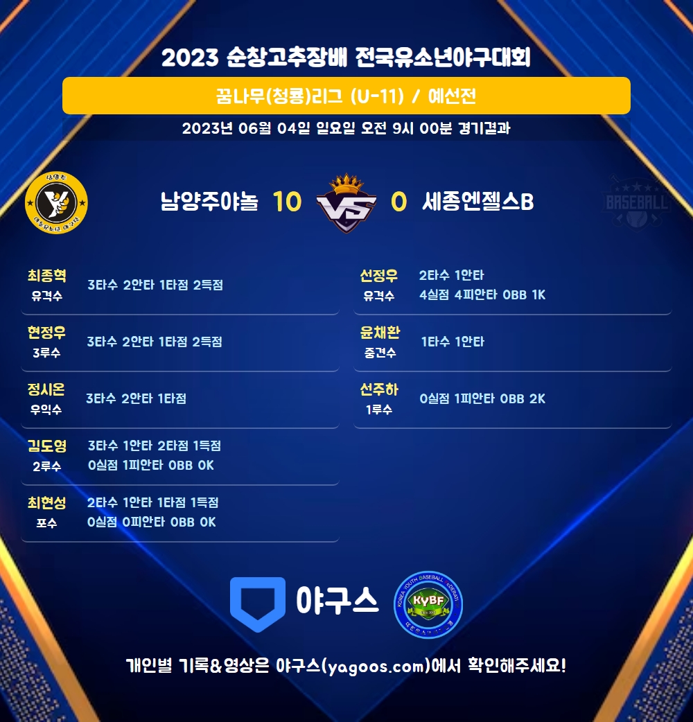 | 1 | 유 | 최종혁(51) | 중플 | 좌전안 | - | 좌중3 | 3 | 2 | 1 | 2 | 0 | 1 | - | 0 | 0.667 |