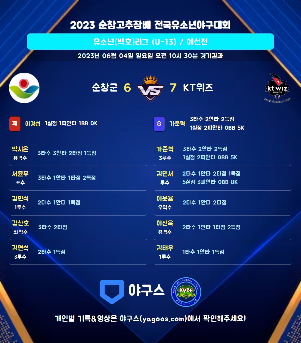 | 2 | 포 | 서윤후(14) | 삼진 | - | - | - | - | 3 | 1 | 1 | 2 | 0 | 4 | - | 1 | 0.333 |
