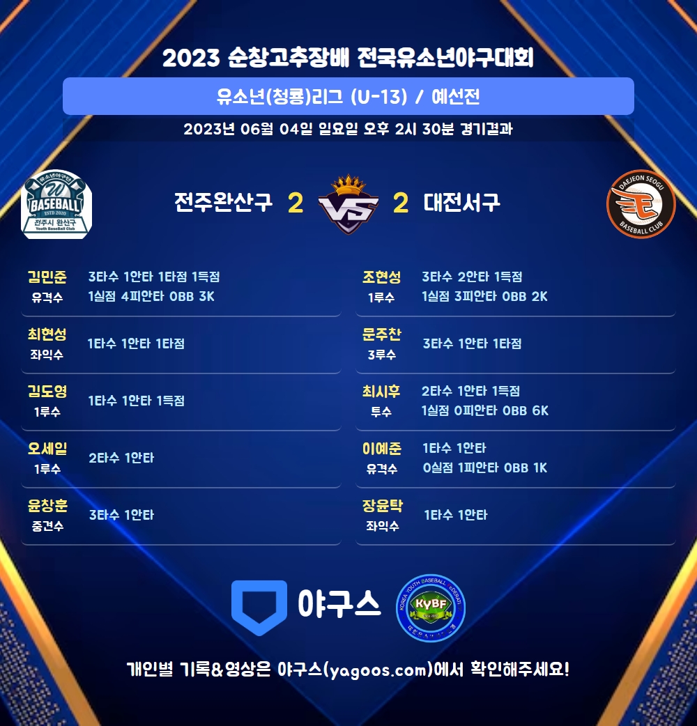 | 1 | 유 | 김민준(2) | 중플 | - | 좌월홈 | - | 중플 | 3 | 1 | 1 | 1 | 0 | 0 | - | 0 | 0.333 |