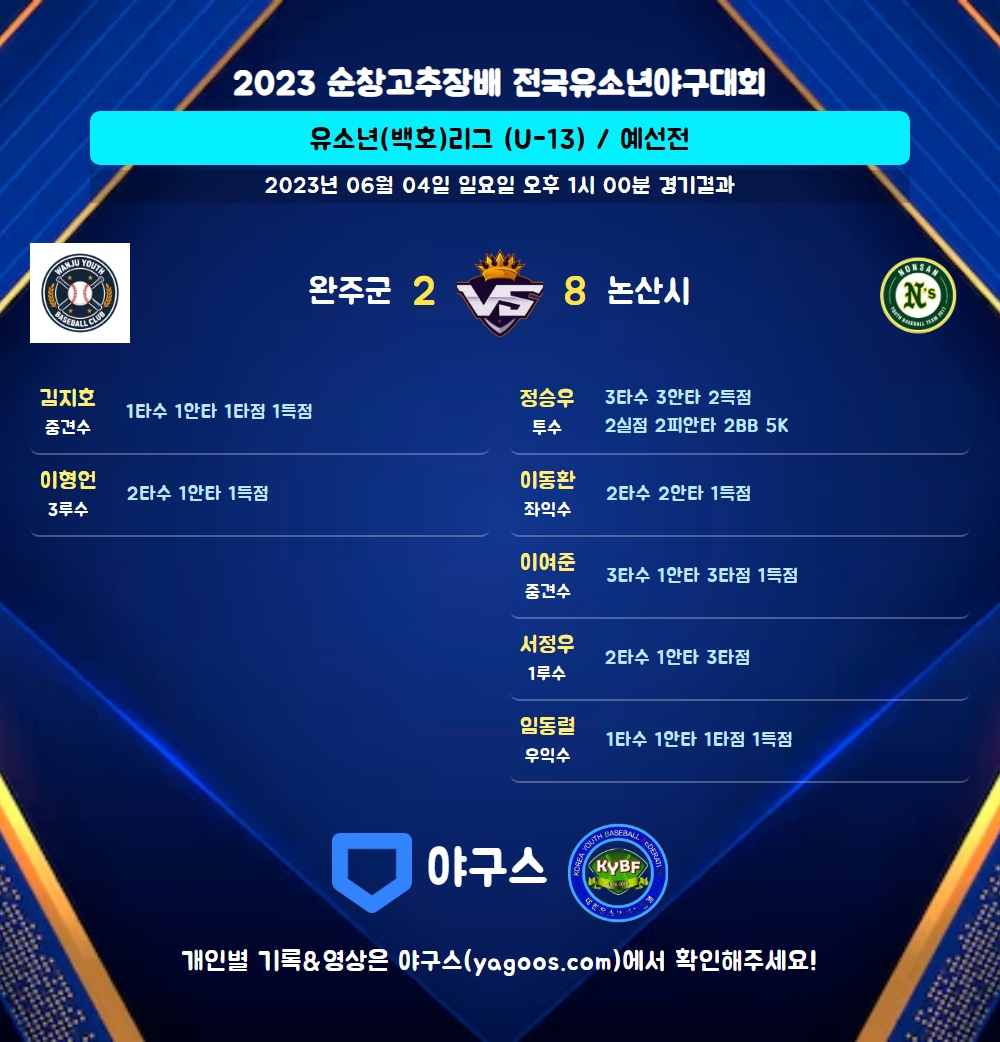 | 2 | 중 | 이여준(11) | 1실 | 3내안 | 유플 | - | 3 | 1 | 3 | 1 | 0 | 1 | - | 0 | 0.333 |