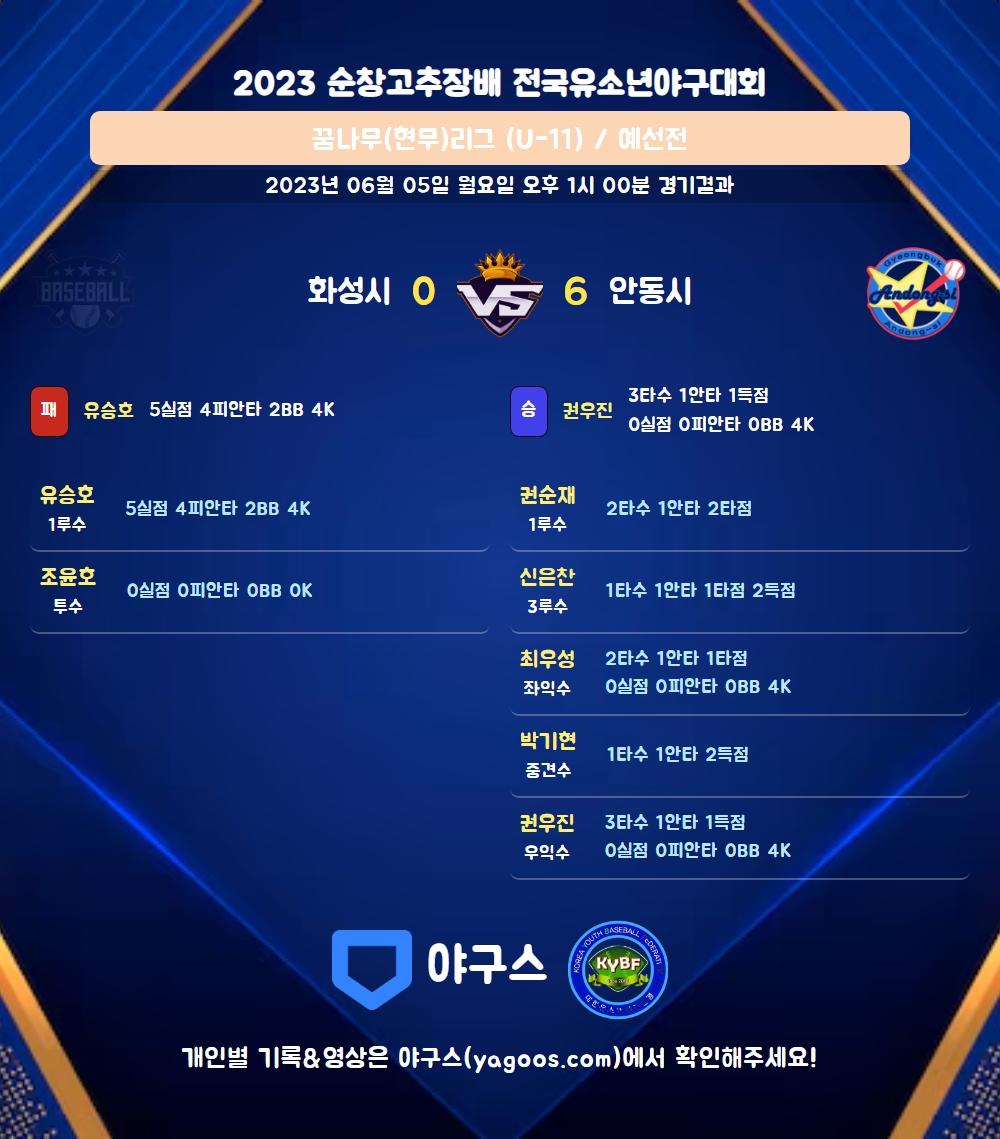 | 팀명 | 1회 | 2회 | 3회 | 4회 | 5회 | R | H | E | B | L |
