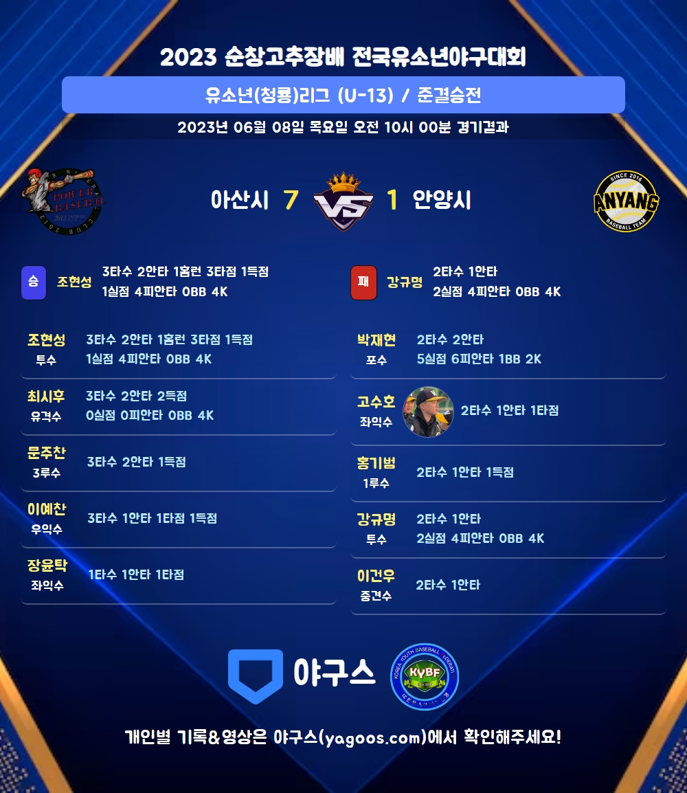 | 8 | 좌 | 고수호(47) | - | 우전안 | - | 삼진 | - | 2 | 1 | 1 | 0 | 0 | 0 | - | 1 | 0.500 |
