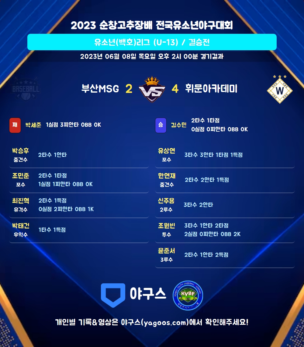 | 4 | 포 | 조민준(11) | - | 유땅 | 투땅 | - | - | 2 | 0 | 1 | 0 | 0 | 0 | - | 0 | 0.000 |