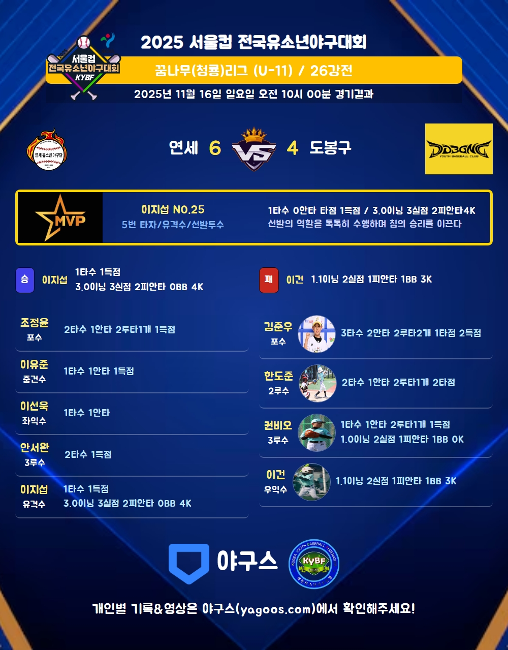 | 1 | 이지섭(25) | 승 | 3.0 | 16 | 10 | 2 | - | 5 | 4 | 65 | 3 | 3 | 9.00 |