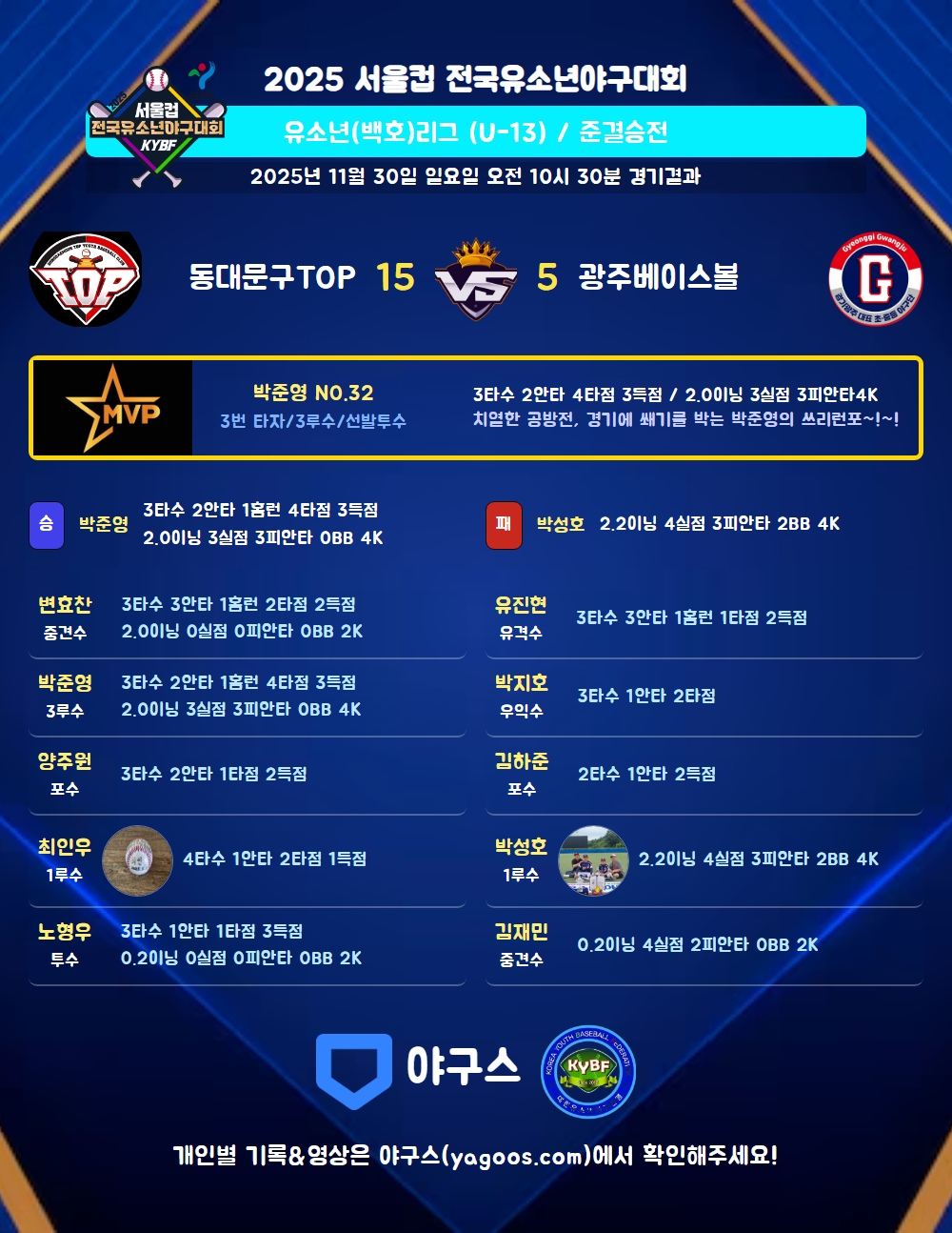 | 5 | 一 | 최인우(16) | - | 유플 | 우안(2타점) | 낫아웃삼진 | 삼진 | - | 4 | 1 | 2 | 1 | - | 1 | - | 2 | 0.250 |