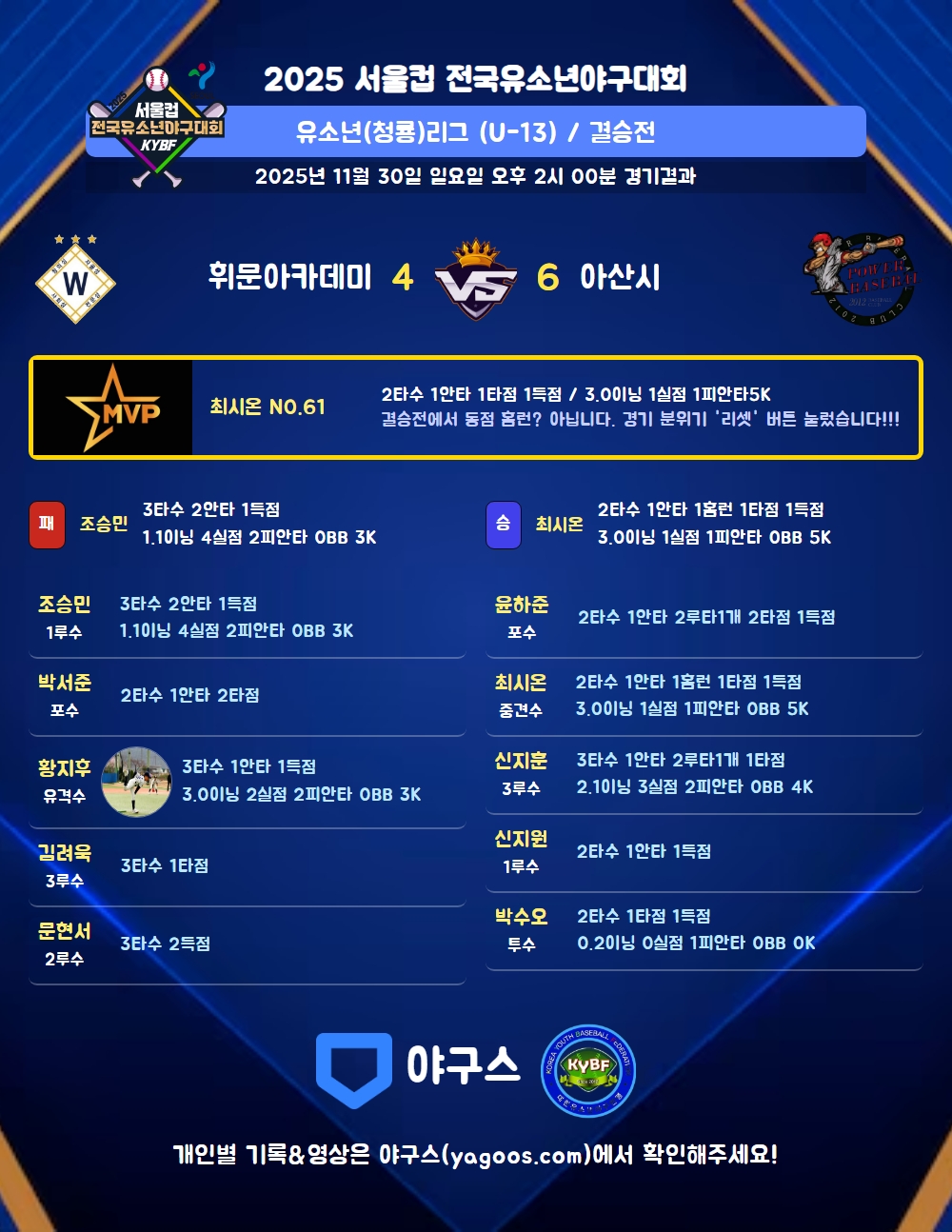 | 9 | 중 | 강민형(11) | - | - | 삼진 | - | - | 삼진 | 2 | 0 | - | - | - | - | - | 2 | 0.000 |