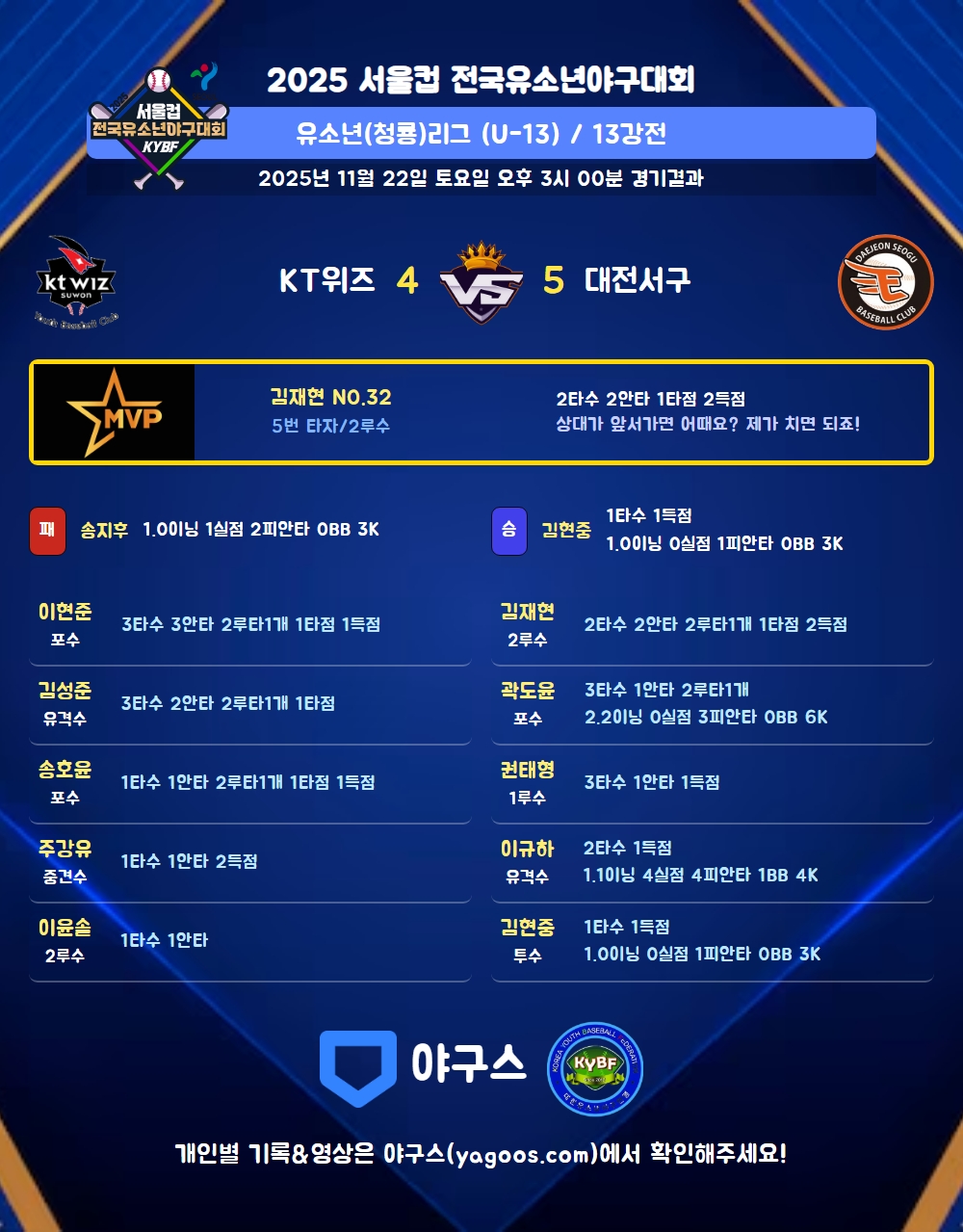 | 2루타 | 송호윤(24) 이현준(155) 김성준(177) 곽도윤(39) 김재현(32) |