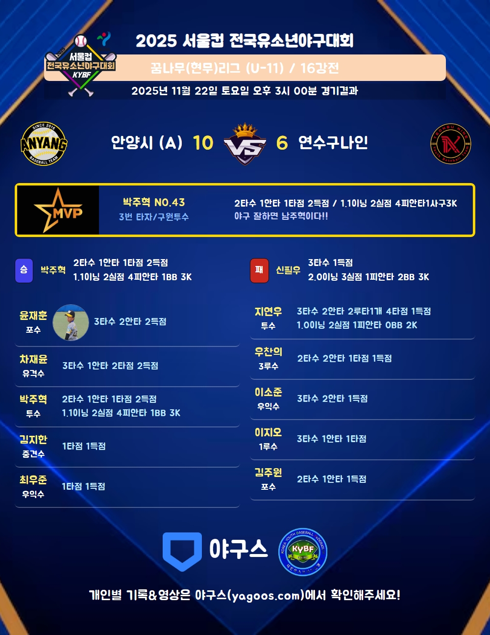 | 3 | 투 | 박주혁(43) | 사구 | 유플 | - | 중안(1타점) | - | 2 | 1 | 1 | 2 | - | - | 1 | - | 0.500 |