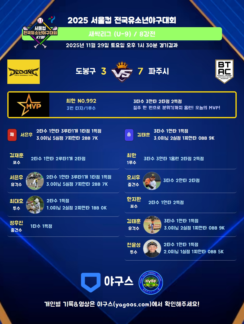 | 3 | 一 | 최한(992) | 중안 | - | 3내안 | 우월G홈(2타점) | - | 3 | 3 | 2 | 2 | 1 | - | - | - | 1.000 |
