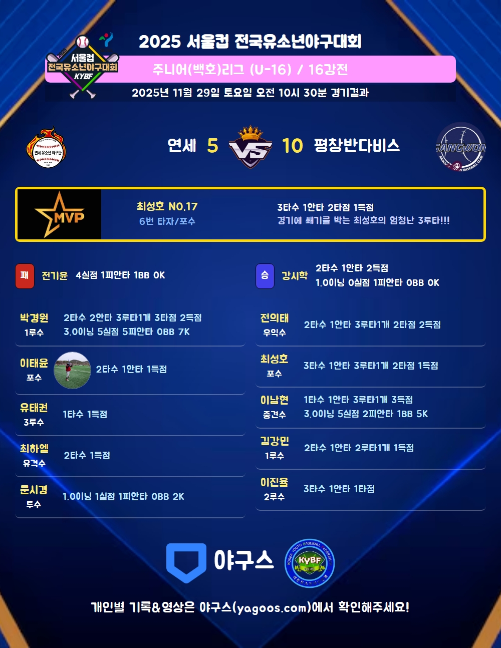 | 6 | 포 | 최성호(17) | 삼진 | - | 삼진 | 좌월3(2타점) | - | 3 | 1 | 2 | 1 | - | - | - | 2 | 0.333 |