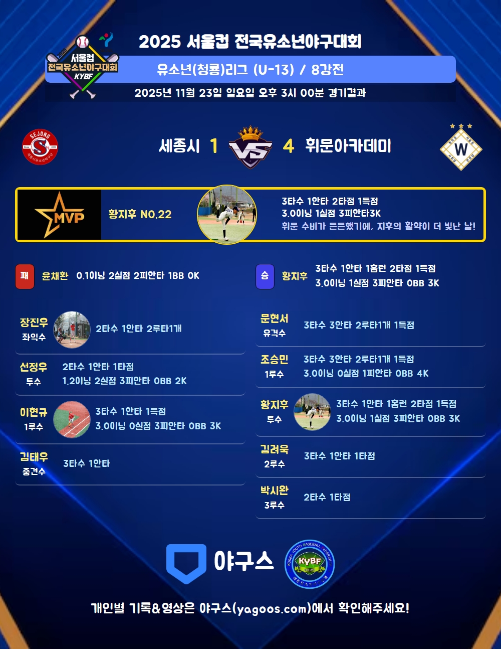 | 2 | 투 | 황지후(22) | 유플 | - | - | 유직 | 좌월홈(2타점) | - | 3 | 1 | 2 | 1 | 1 | - | - | - | 0.333 |