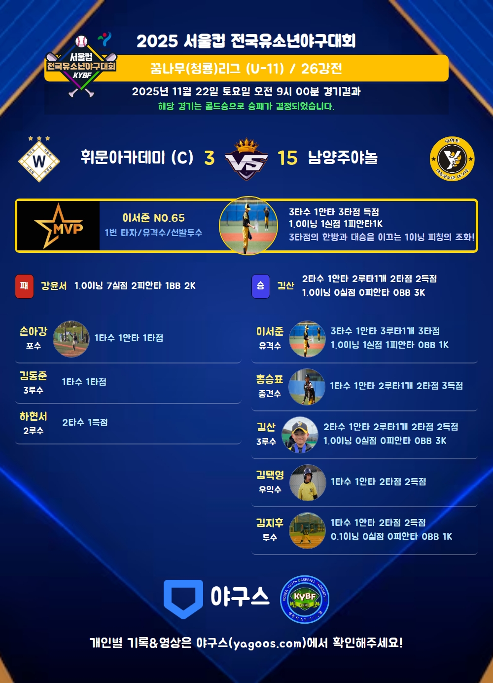 | 1 | 유 | 이서준(65) | 1플/우월3(3타점) | 유땅 | - | 3 | 1 | 3 | - | - | - | - | - | 0.333 |