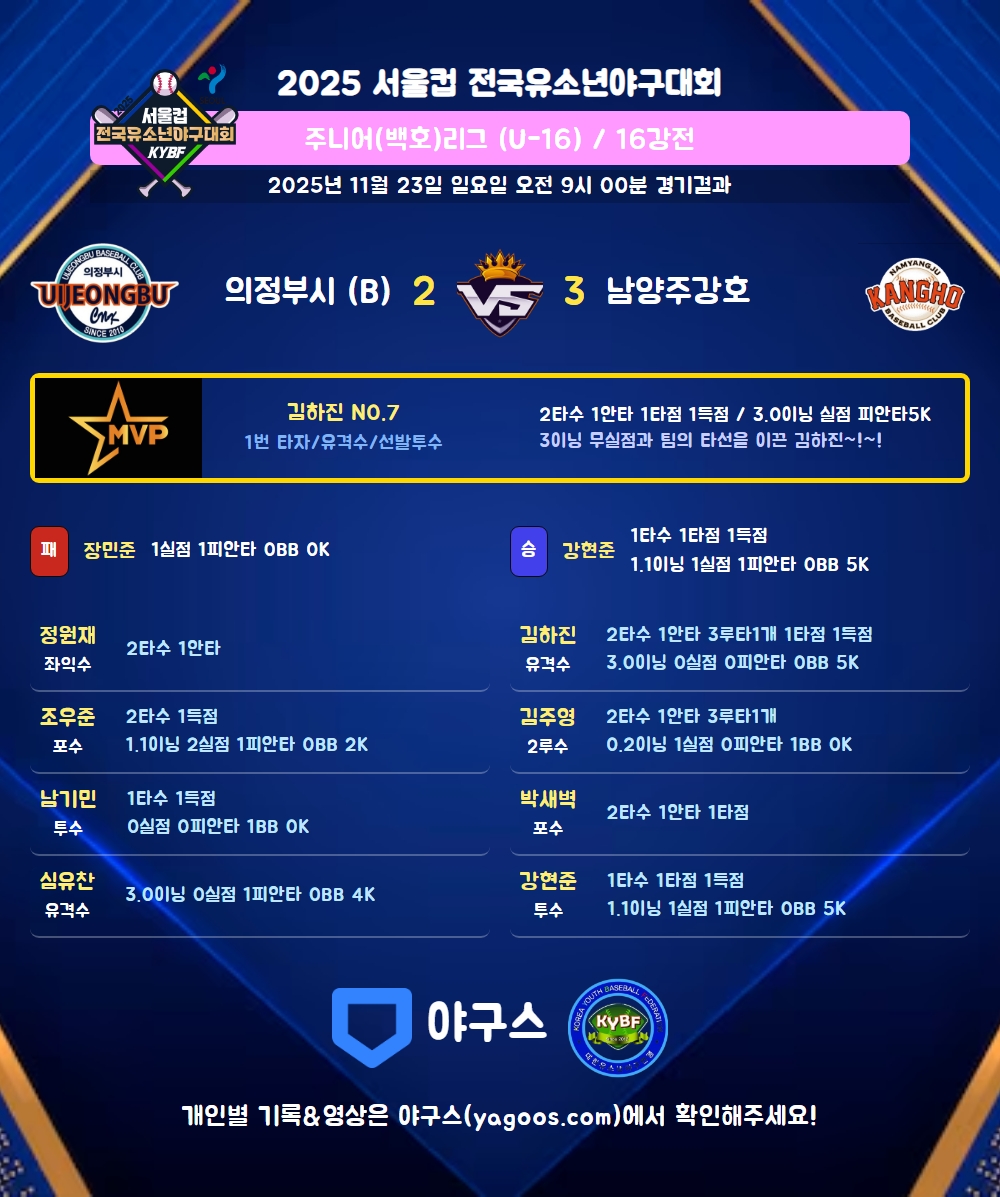 | 3 | 강현준(1111) | 승 | 1.1 | 8 | 7 | 1 | - | 1 | 5 | 43 | 1 | 1 | 6.75 |