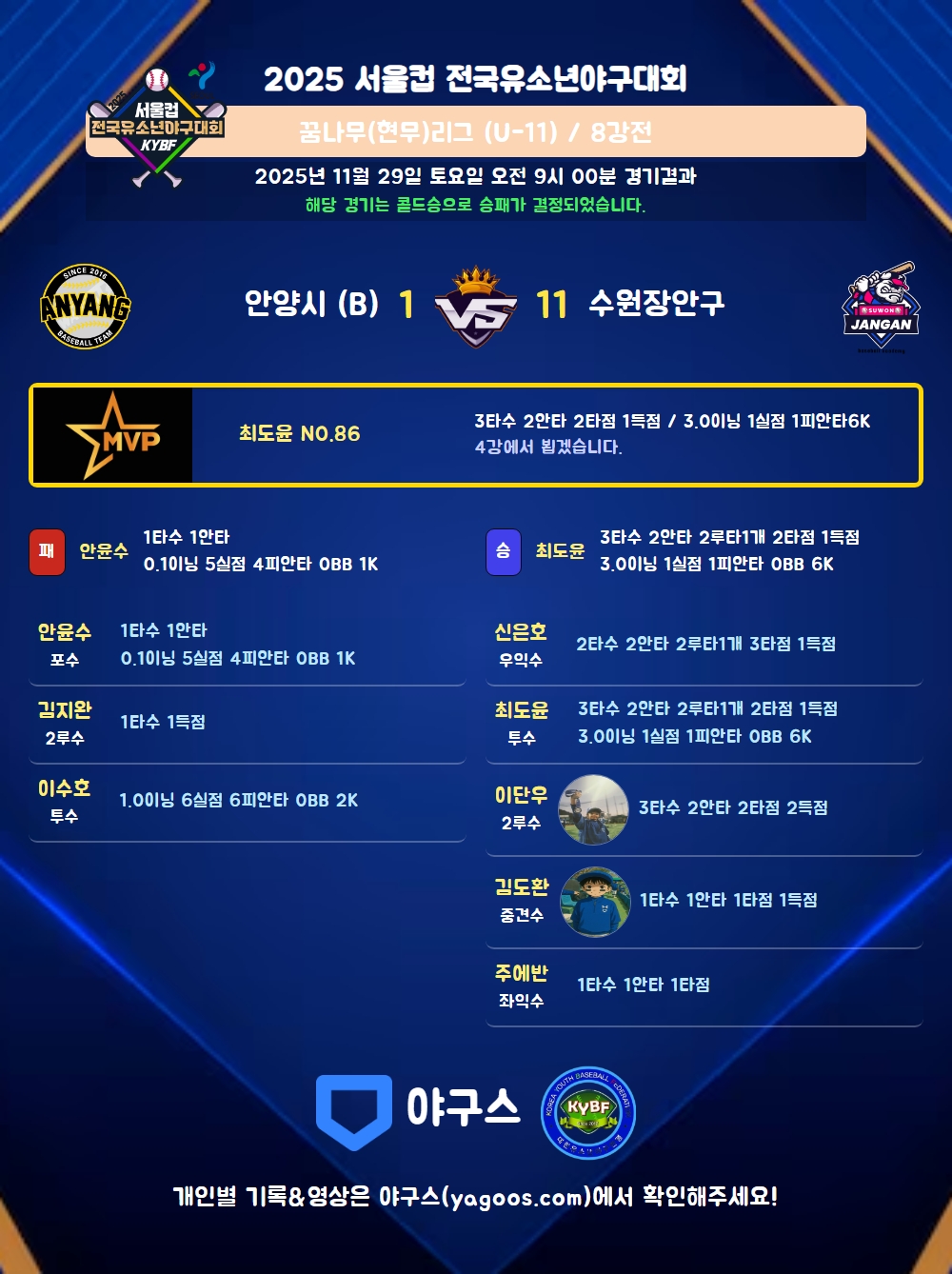 | 1 | 최도윤(86) | 승 | 3.0 | 11 | 11 | 1 | - | - | 6 | 43 | 1 | - | 0 |