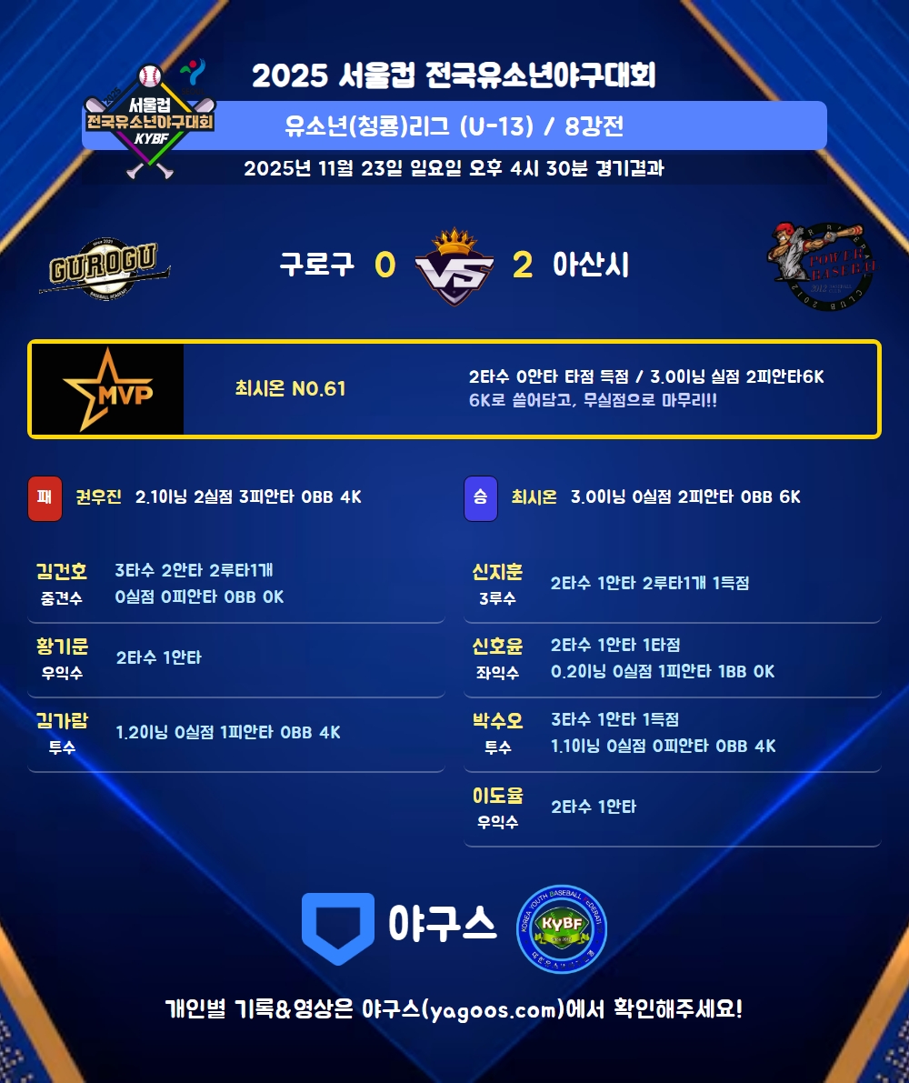 | 1 | 권우진(21) | 패 | 2.1 | 11 | 11 | 3 | - | - | 4 | 39 | 2 | 2 | 7.71 |