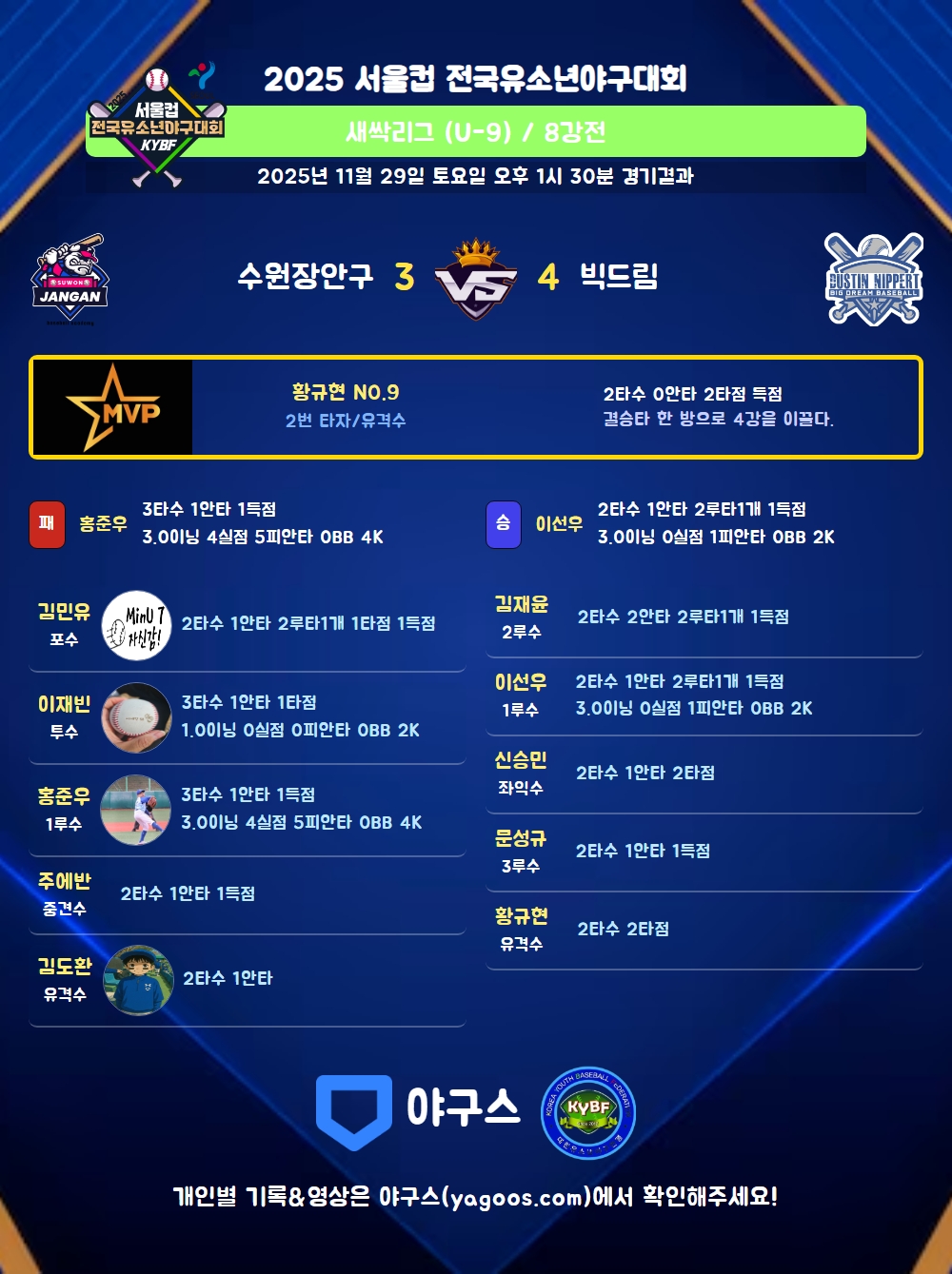 | 1 | 투 | 이재빈(58) | 삼진 | - | 유직 | - | 우중안(1타점) | 3 | 1 | 1 | - | - | - | - | 1 | 0.333 |