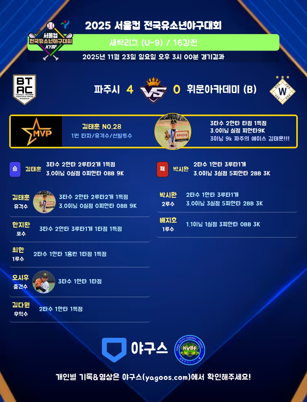 | 휘문아카데미 (B) | 0 | 0 | 0 | 0 | 0 | 0 | 0 | 1 | 0 | 2 | 3 |