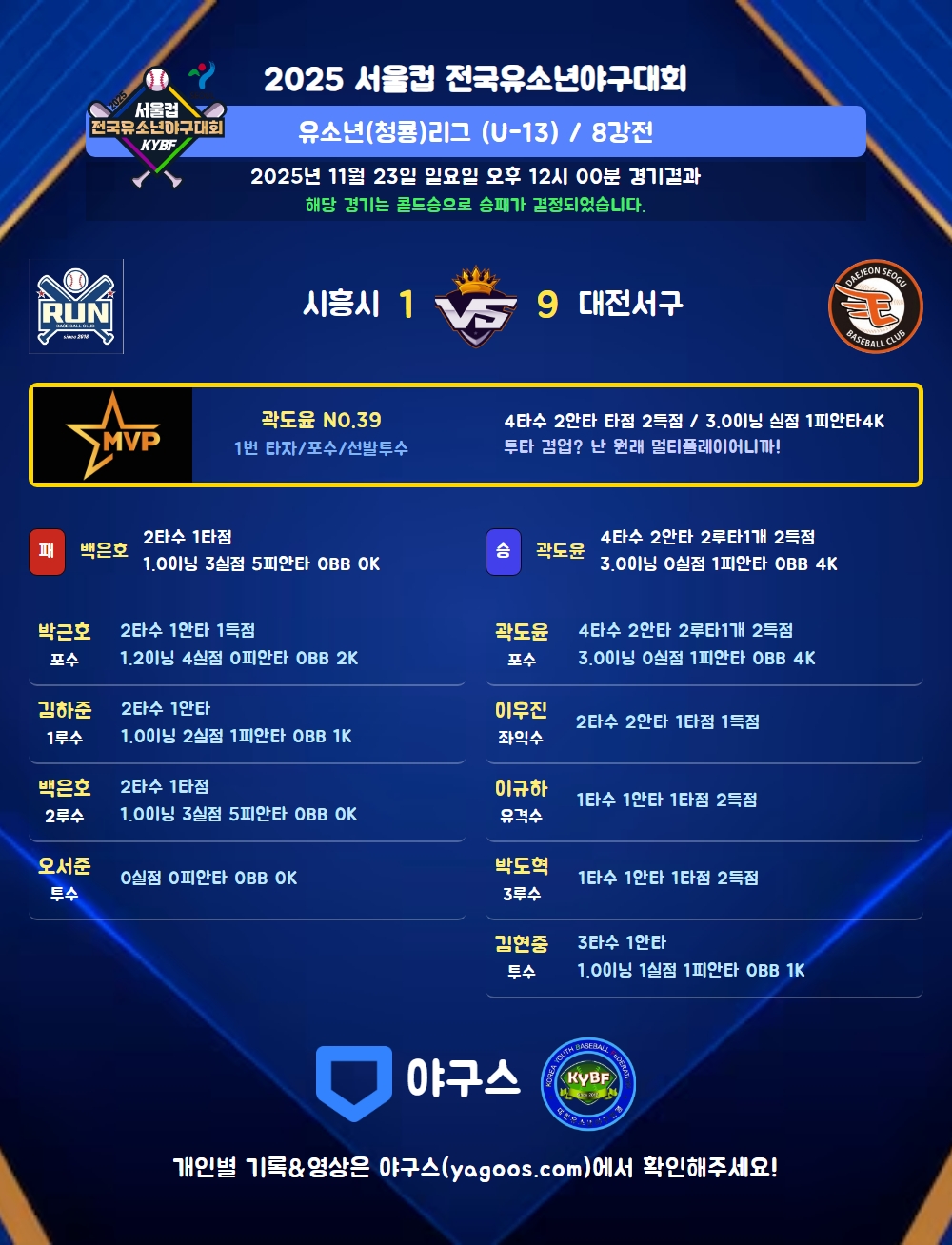 | 1 | 곽도윤(39) | 승 | 3.0 | 9 | 9 | 1 | - | - | 4 | 31 | - | - | 0 |