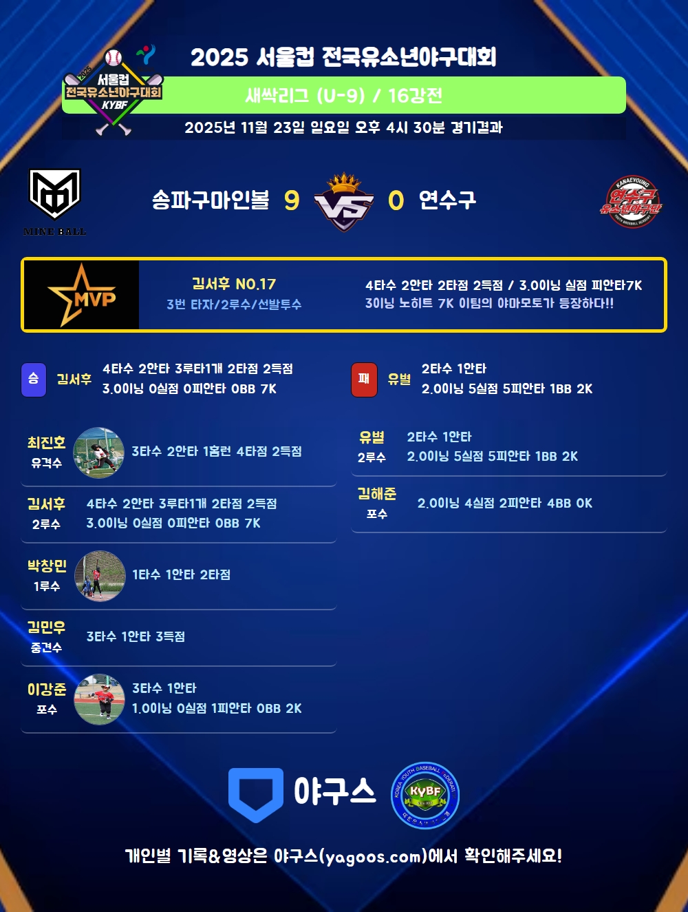 | 1 | 김서후(17) | 승 | 3.0 | 10 | 9 | - | - | 1 | 7 | 43 | - | - | 0 |