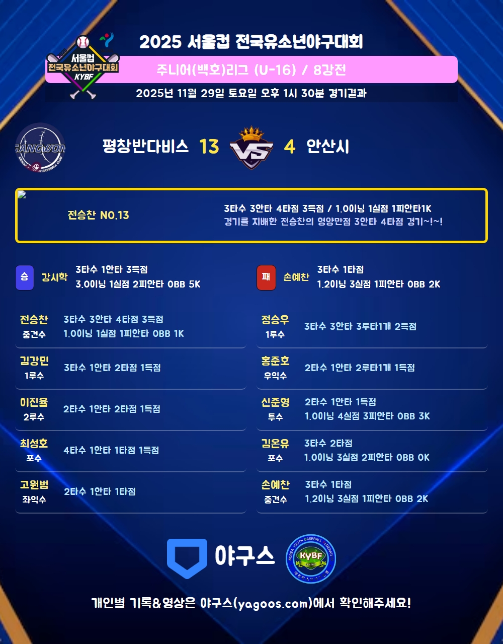 | 5 | 중 | 전승찬(13) | 우중안(1타점) | - | 우안(2타점) | 4구 | 좌선안(1타점) | - | 3 | 3 | 4 | 3 | - | 1 | 1 | - | 1.000 |