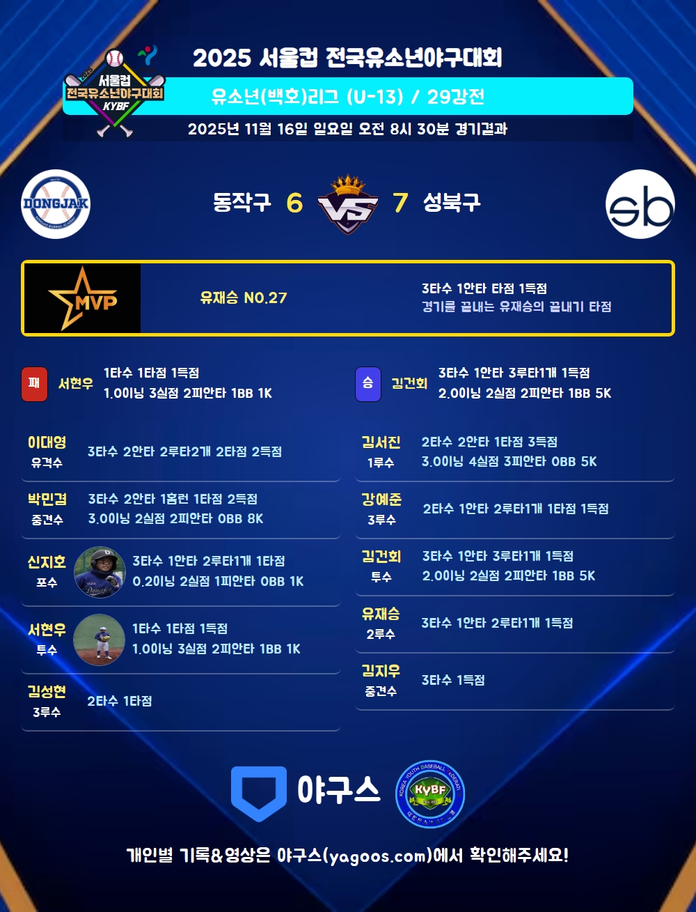 | 2루타 | 이대영(51) 신지호(10) 강예준(32) 유재승(27) |