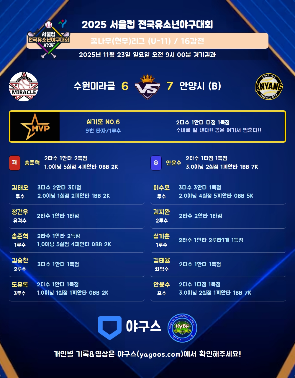 | 1 | 一 | 송준혁(7) | 삼진 | - | 사구 | 3내안 | - | 2 | 1 | - | 2 | - | - | 1 | 1 | 0.500 |