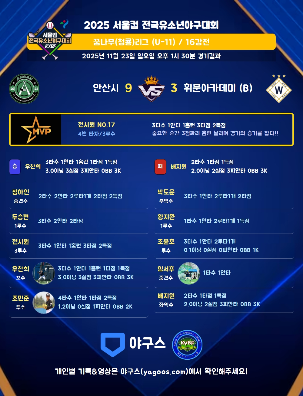 | 3 | 우 | 박도윤(11) | 삼진 | - | 좌중2(2타점) | - | 1파플 | - | 3 | 1 | 2 | - | - | - | - | 1 | 0.333 |