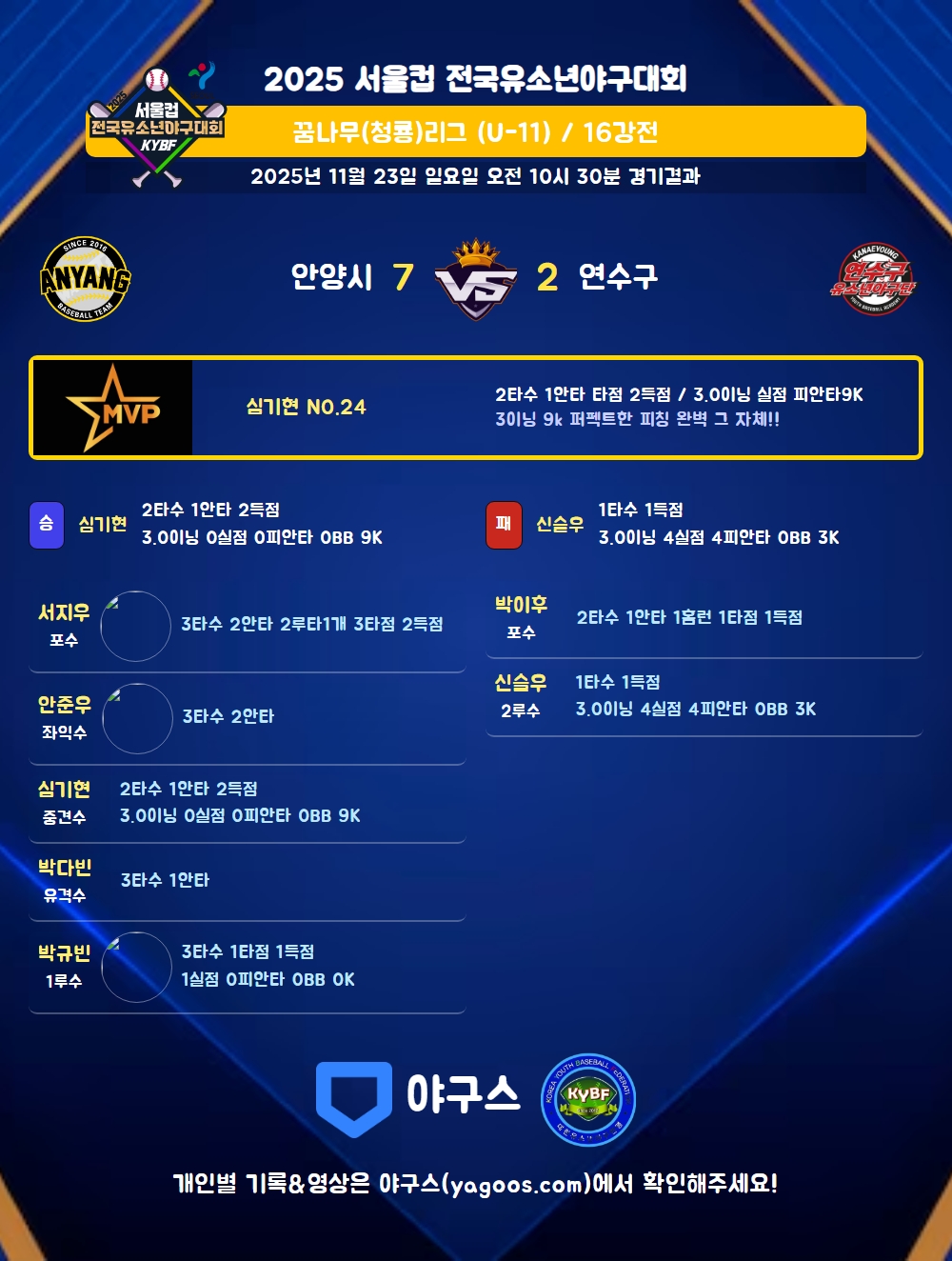 | 3 | 포 | 서지우(38) | 투땅 | - | 우중2(2타점) | 우중안(1타점) | - | 3 | 2 | 3 | 2 | - | - | - | - | 0.667 |