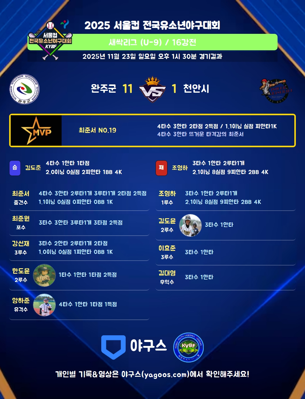| 5 | 一 | 김도준(16) | 삼진 | 우선안(1타점) | - | 1플 | 투땅출 | - | 4 | 1 | 1 | - | - | - | - | 1 | 0.250 |