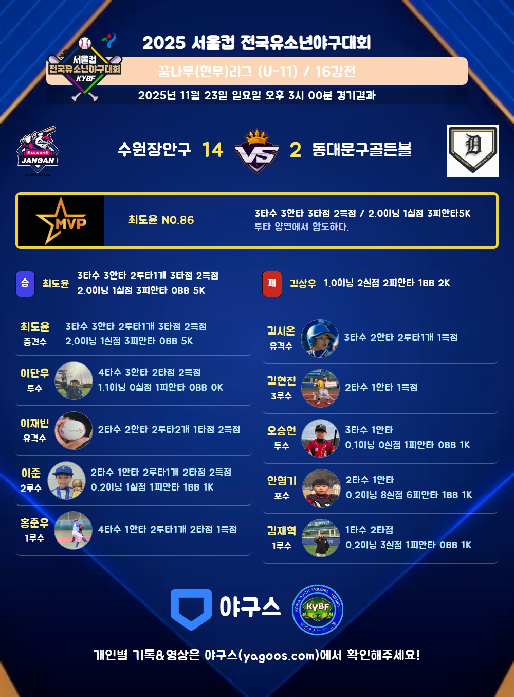 | 2루타 | 홍준우(47) 이준(38) 최도윤(86) 김민유(7) 이재빈(58) 김시온(6) |