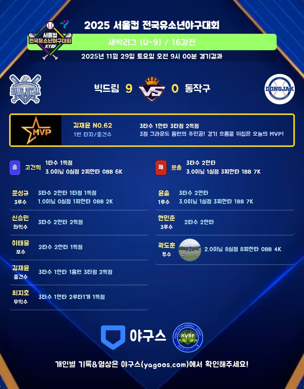 | 1 | 고건희(45) | 승 | 3.0 | 12 | 11 | 2 | - | 1 | 6 | 45 | - | - | 0 |