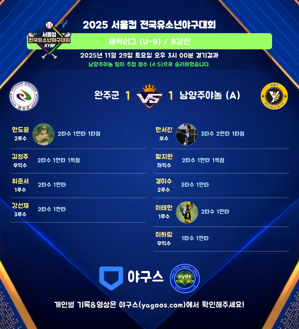 | 2 | 二 | 한도윤(11) | 투땅 | - | 4구 | - | 3내안(1타점) | - | 2 | 1 | 1 | - | - | - | 1 | - | 0.500 |
