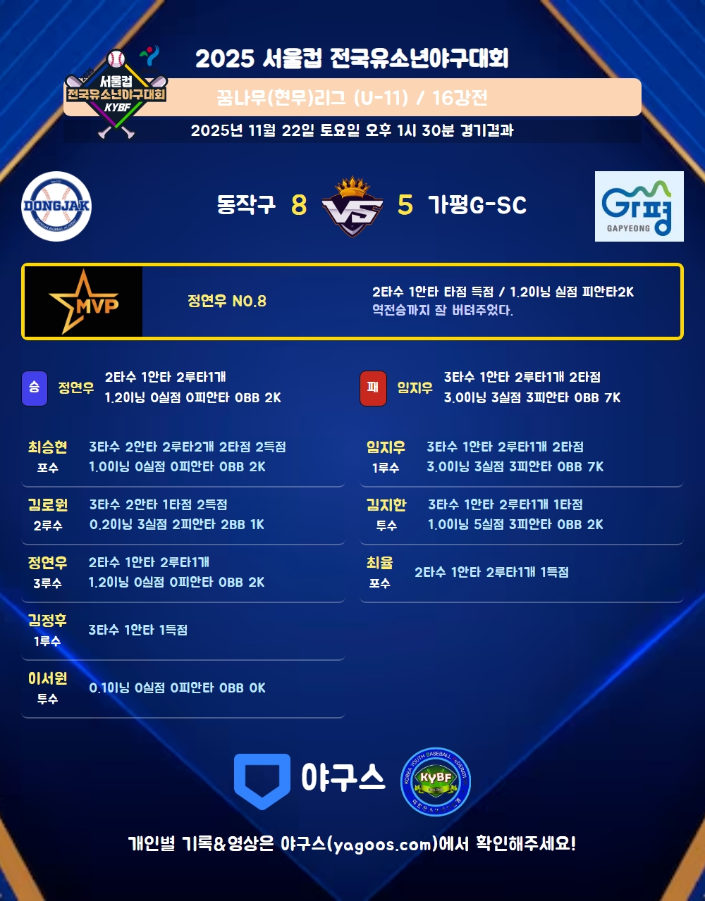 | 2 | 정연우(8) | 승 | 1.2 | 8 | 5 | - | - | 3 | 2 | 29 | - | - | 0 |
