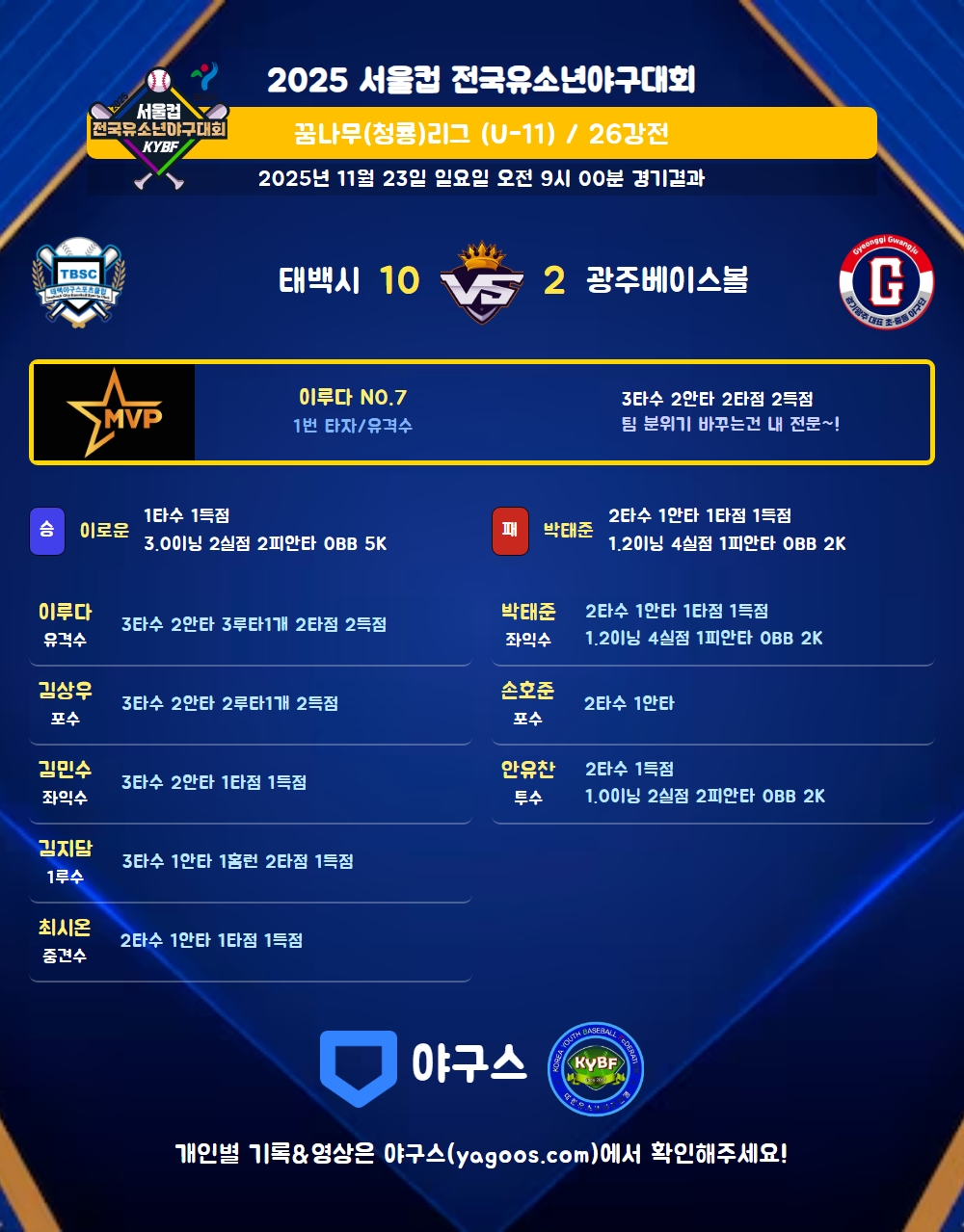 | 광주베이스볼 | 2 | 0 | 0 | 0 | 0 | 2 | 2 | 2 | 1 | 1 |