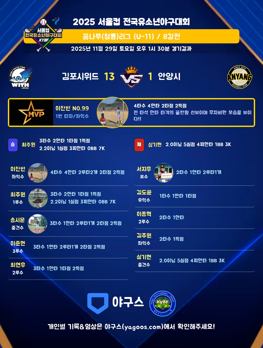 | 1 | 좌 | 이찬빈(99) | 좌안 | 중전2 | 좌중2(1타점) | 중안(1타점) | - | 4 | 4 | 2 | 2 | - | - | - | - | 1.000 |
