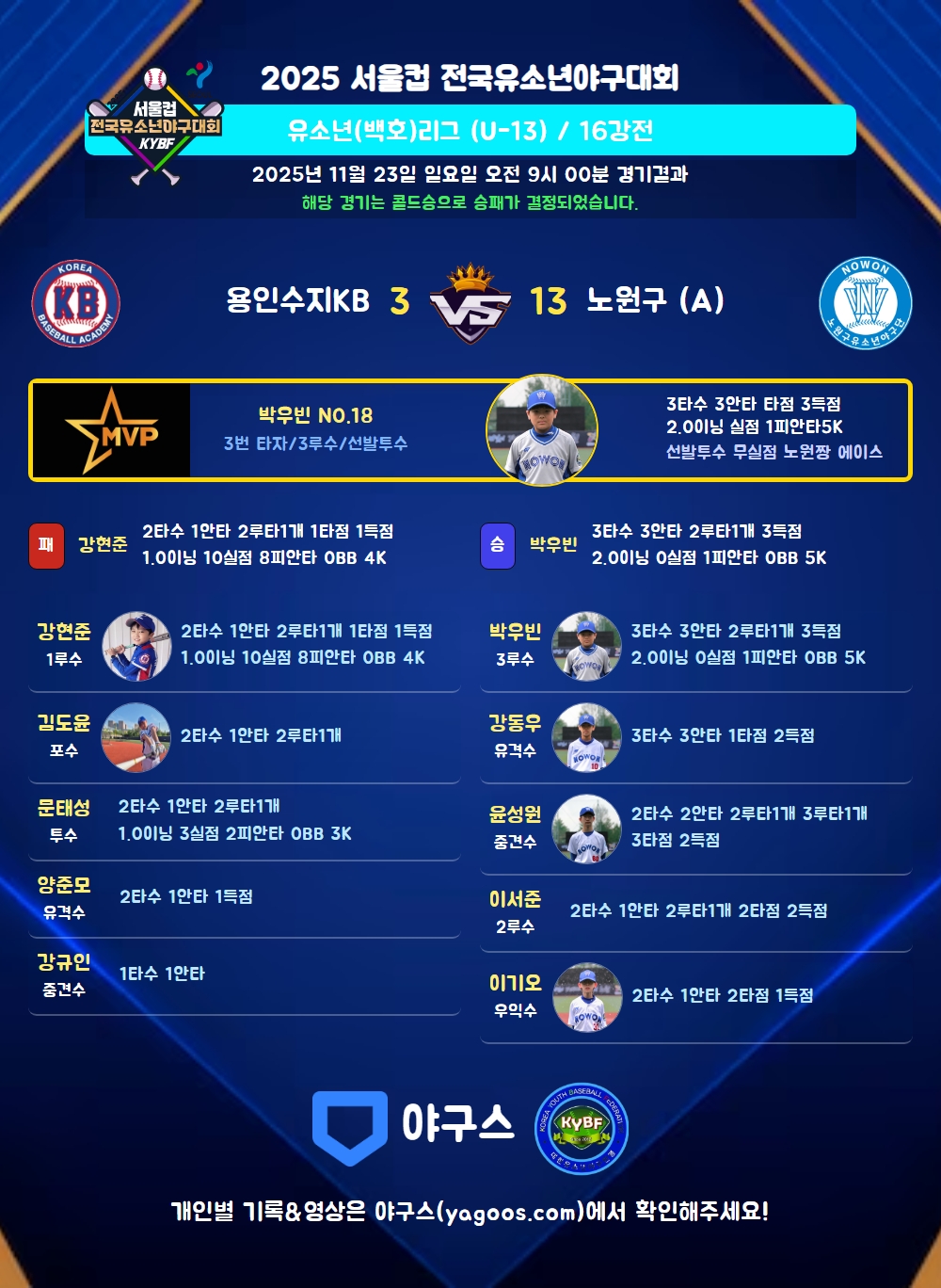 | 2루타 | 강현준(10) 김도윤(25) 문태성(510) 이서준(7) 박우빈(18) 윤성원(60) |
