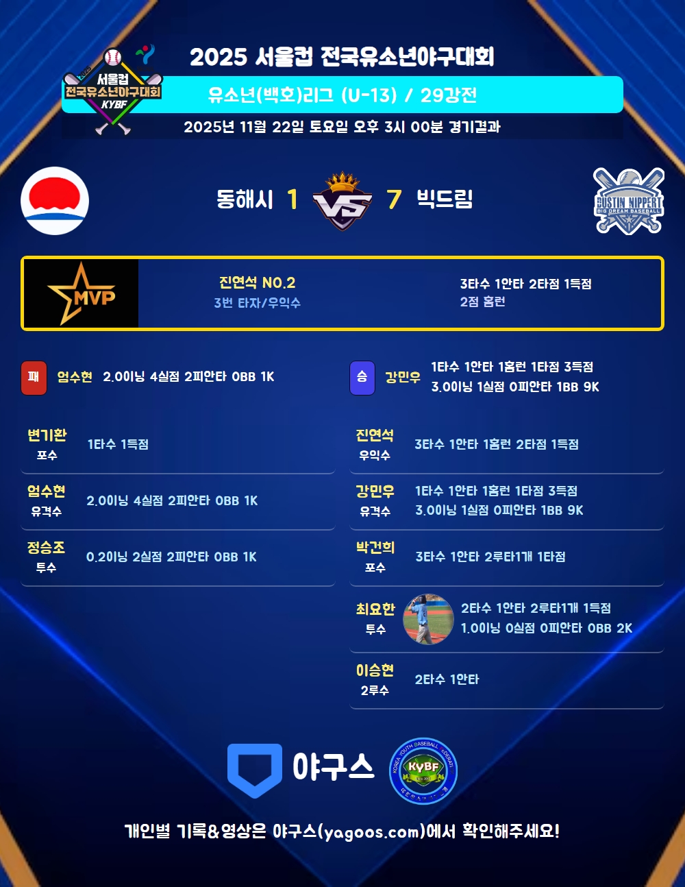 | 3 | 우 | 진연석(2) | 1땅 | - | 좌중홈(2타점) | 유플 | 3 | 1 | 2 | 1 | 1 | - | - | - | 0.333 |