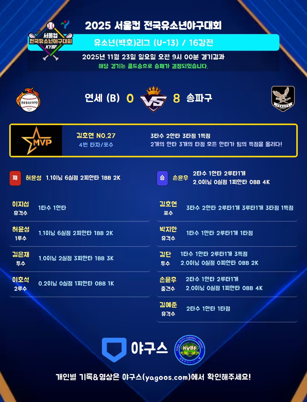 | 2루타 | 김단(9) 김호연(27) 손윤우(23) 박지안(22) |