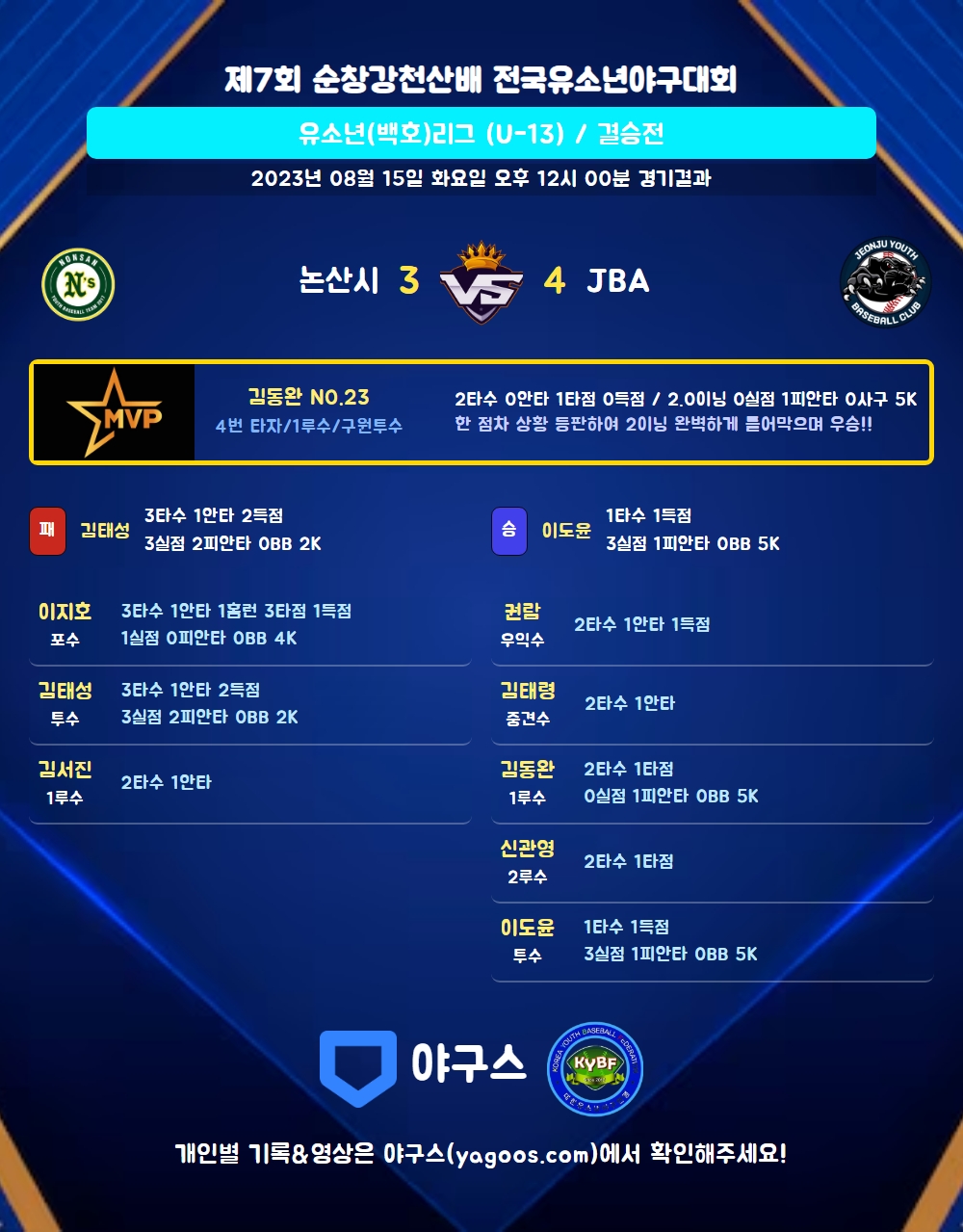 | 팀명 | 1회 | 2회 | 3회 | 4회 | 5회 | R | H | E | B | L |
