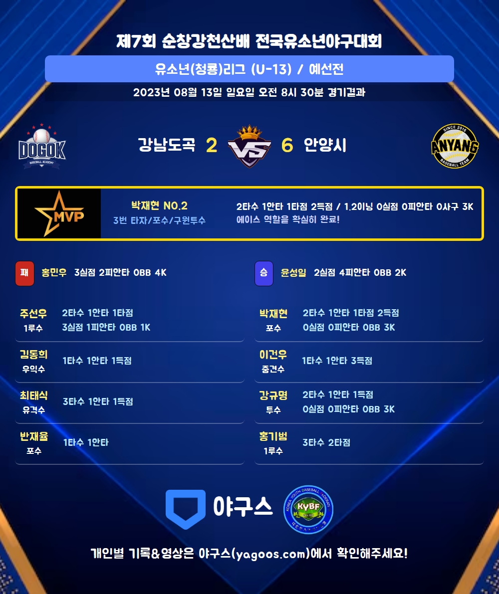 | 1 | 투 | 강규명(17) | 2땅 | - | 중전안 | 4구 | - | 2 | 1 | 0 | 1 | 0 | 2 | 1 | 0 | 0.500 |