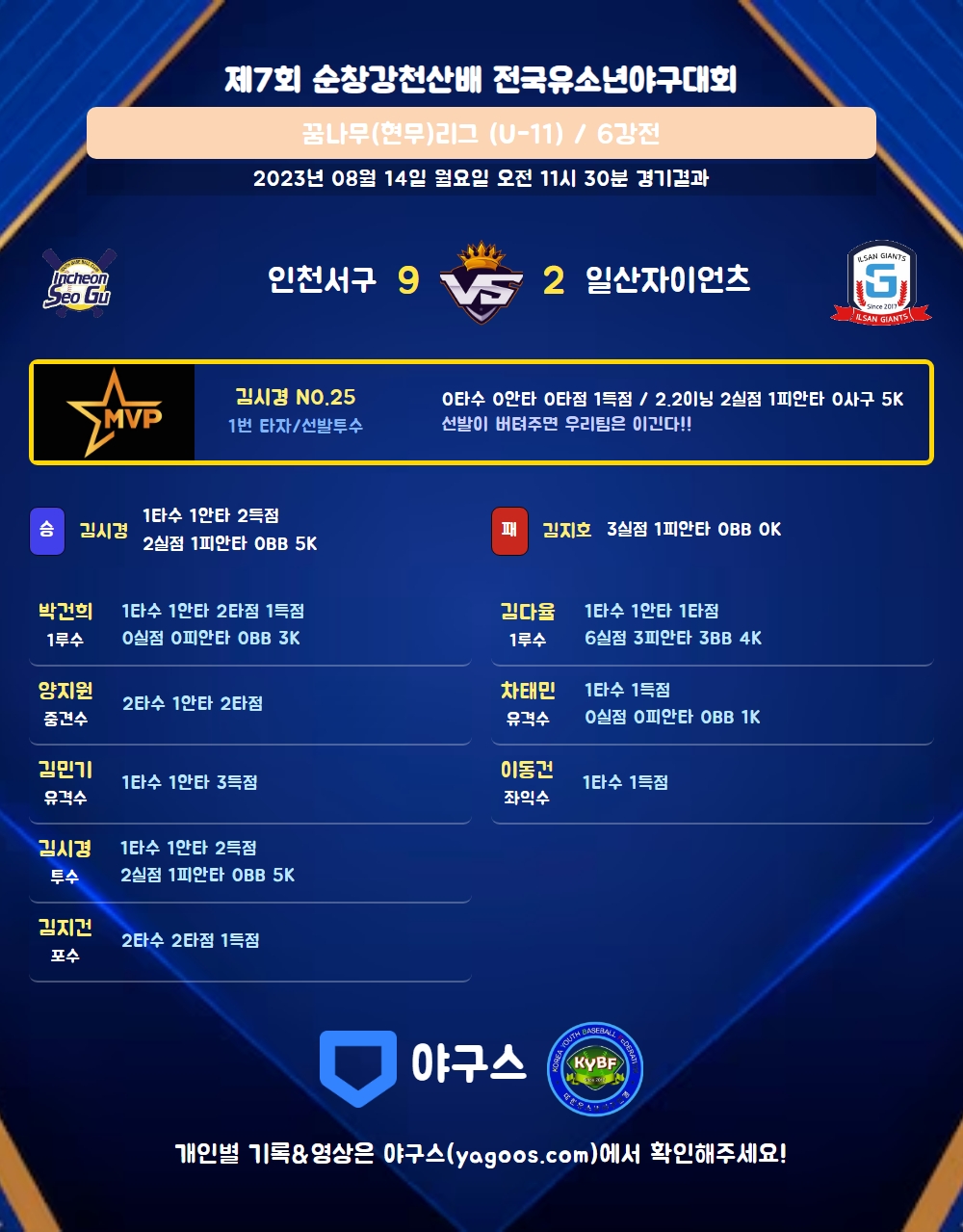 | 일산자이언츠 | 1 | 0 | 1 | 0 | 2 | 1 | 0 | 4 |