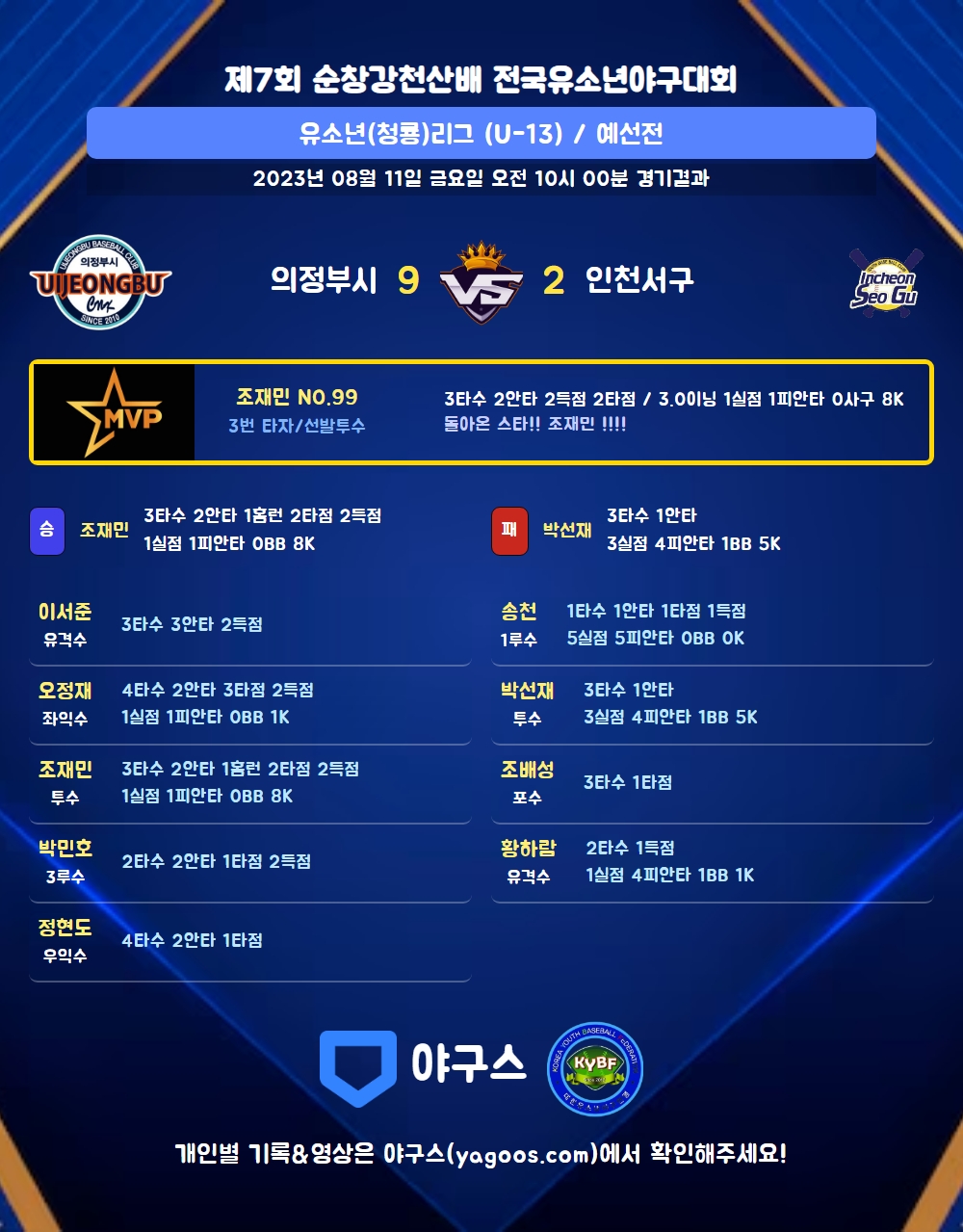 | 2 | 二 | 노은찬(8) | 투땅 | - | 삼진 | - | - | 삼진 | 3 | 0 | 0 | 0 | 0 | 0 | - | 2 | 0.000 |