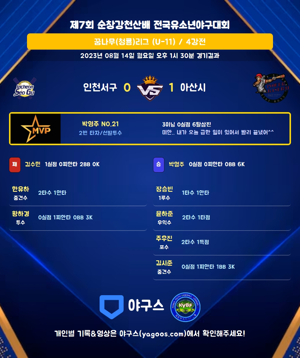 | 2 | 투 | 박영주(21) | 삼진 | - | - | 우플 | - | 2 | 0 | 0 | 0 | 0 | 0 | - | 1 | 0.000 |