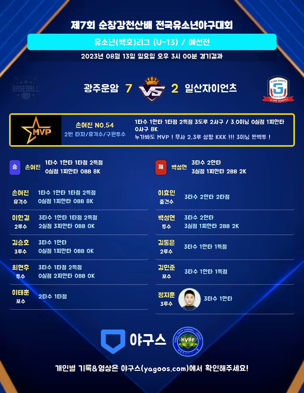 | 2 | 유 | 손여진(54) | 사구 | - | 사구 | - | 좌월2 | - | 1 | 1 | 1 | 2 | 0 | 3 | 2 | 0 | 1.000 |