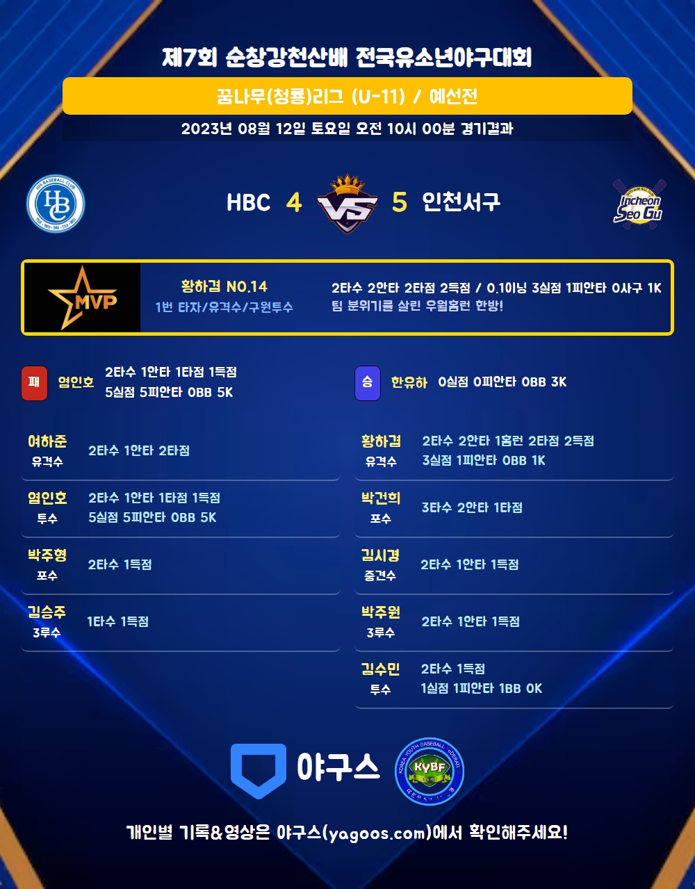 | 1 | 염인호(24) | 패 | - | 21 | 7 | 5 | 1 | 4 | 5 | 70 | 5 | 5 | 0 |