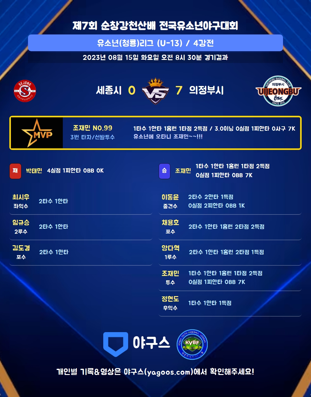 | 홈런 | 조재민(99) 채용호(19) 양다혁(46) |